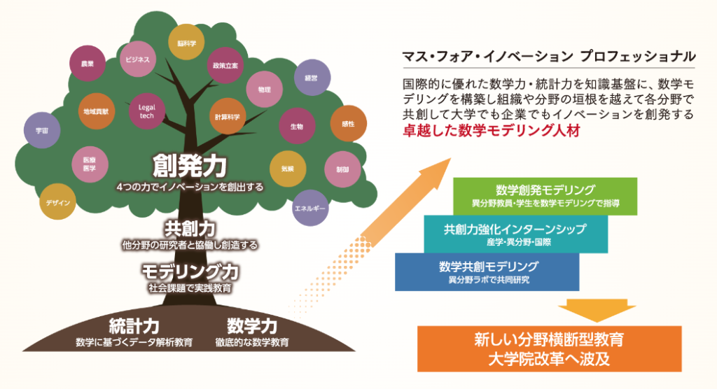 「マス・フォア・イノベーション卓越大学院プログラム」とは、文部科学省令和2年度「卓越大学院プログラム」に採択された学位プログラムで、国際的に優れた数学力及び統計力を基盤として、組織や分野の垣根を越え、数学モデリング力を活かして各分野で共創し、イノベーションを創発する卓越した数学博士人材を育成することを目的としています。