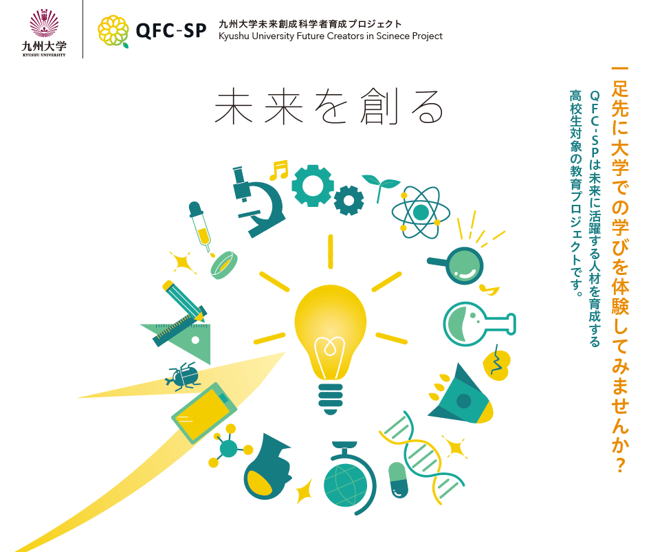 「九州大学未来創成科学者育成プロジェクト(QFC-SP)」は、未来に活躍する次世代の人材を育成するため、意欲・能力を有する高校生を選抜し、九州大学の幅広い学部・大学院などの研究室において年間を通じ、高度で実践的な教育を行い、その意欲・知識・技能をさらに伸ばしていくことを目的とする高校生対象の教育プロジェクトです。