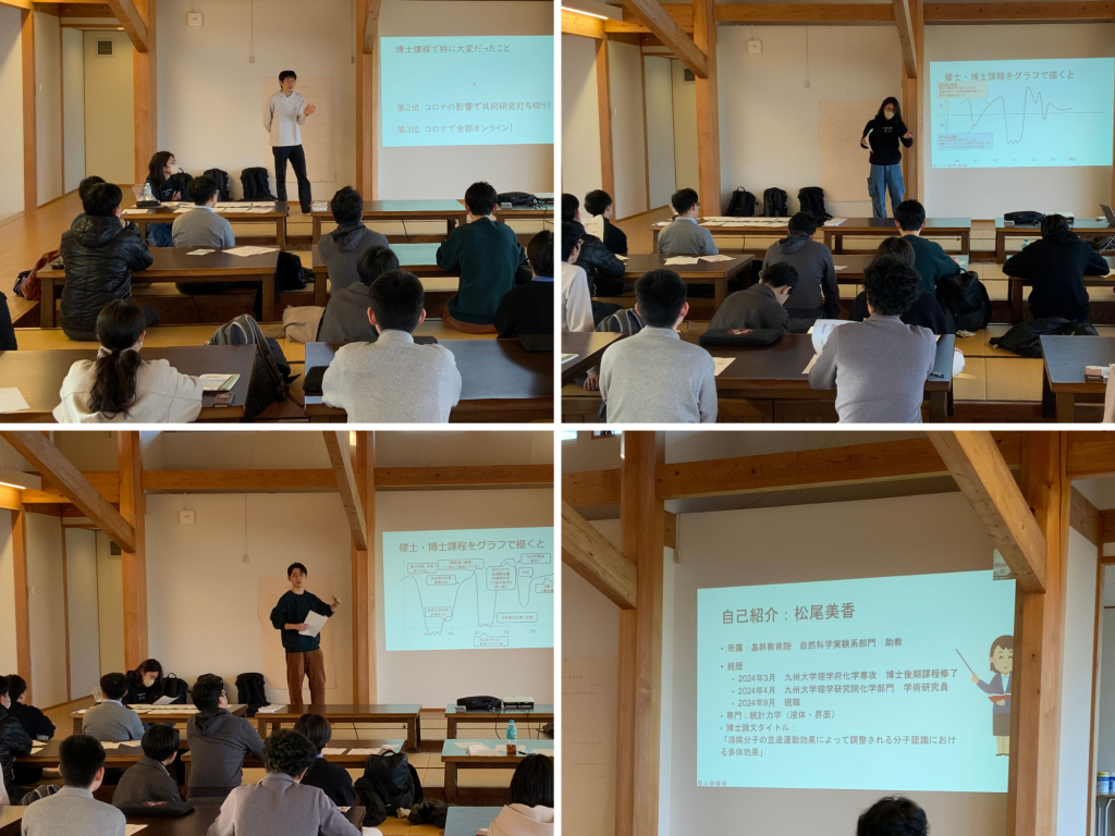 九州大学大学院理学研究院の足立惇弥助教、基幹教育院の松尾美香助教、工学府博士課程3年の出口翔大さん、 理学府博士課程3年の塚原壮平さんに講演していただきました(松尾先生は録音にて)。修士課程・博士課程での経験をグラフで示しつつ、研究における浮き沈みや学会での出来事を、当時の心境を振り返りながらお話しくださいました。博士課程で特に大変だったこと、博士課程に行って良かったこと、後輩へのメッセージは、参加者の皆さんの心に響いたようでした。