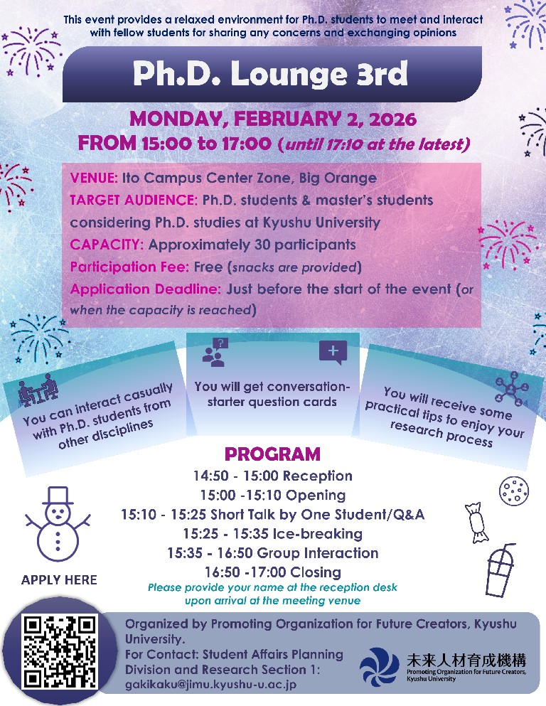 In addition, information on support services available at Kyushu University will be introduced, with the aim of helping students – especially those experiencing academic or personal stress – identify resources that may support their research, well-being, and overall student life.